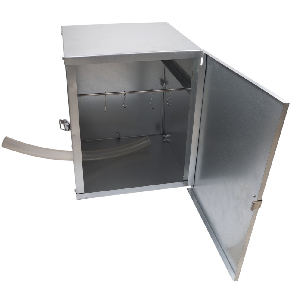 У камеры полностью разборная конструкция. Она не занимает много места при хранении и транспортировке. С одной стороны, камера для копчения мобильна и компактна, а с другой, вмещает до 20 кг мяса. В собранном состоянии ее объем — 50 л. Продукты можно подвешивать на крючках, которые уже включены в стандартную комплектацию.