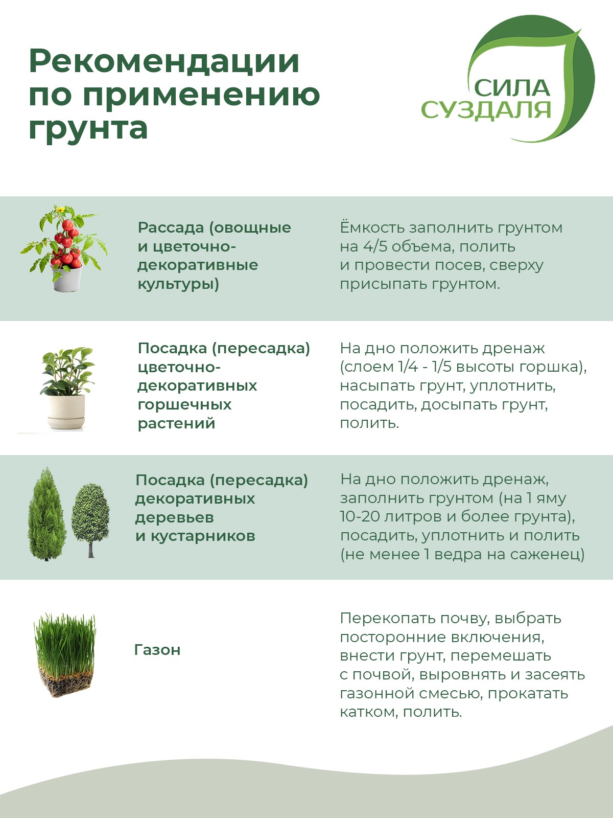 Универсальный грунт для растений - уникальный грунт, сочетающий в себе все необходимые полезные свойства. Так же может быть использован вместе с какими-либо удобрениями или добавками. Грунт в меру увлажненный, представлен в разных объёмах. Предназначен для выращивания всех культур, требующий нейтральной среды (Ph). Повышает всхожесть высеянных семян, при пересадках обеспечивает высокую приживаемость. Увеличенное содержание доступных форм элементов питания и биологически активных веществ способствует оздоровлению больных или поврежденных растений при пересадке. После пересадки следует полить растение и убедиться, что процесс пересадки прошел правильно. Может использоваться как для комнатных растений, так и для тепличных. Обеспечивает обильное цветение и плодоношение.
